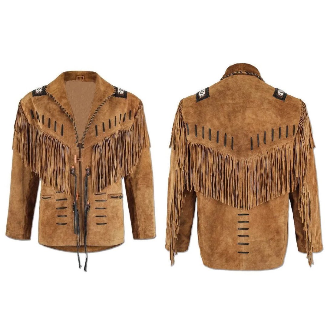 Men’s Traditional Western Cowboy Leather Jacket coat with fringe and beads